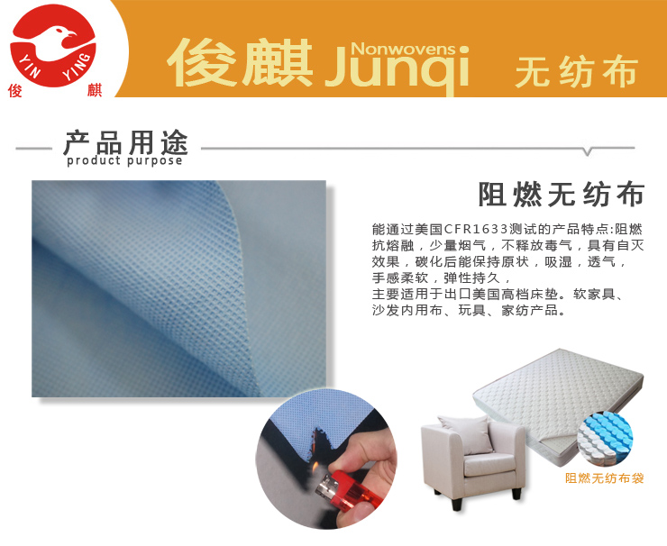 阻燃无妨布是通过美国CFR1633测试的产品,它的特点是:阻燃,抗熔融,少量烟气,不释放毒气,具有自灭效果,碳化后能保持原状,吸湿,透气,手感柔软,弹性持久,主要适应于出口美国高档床垫。