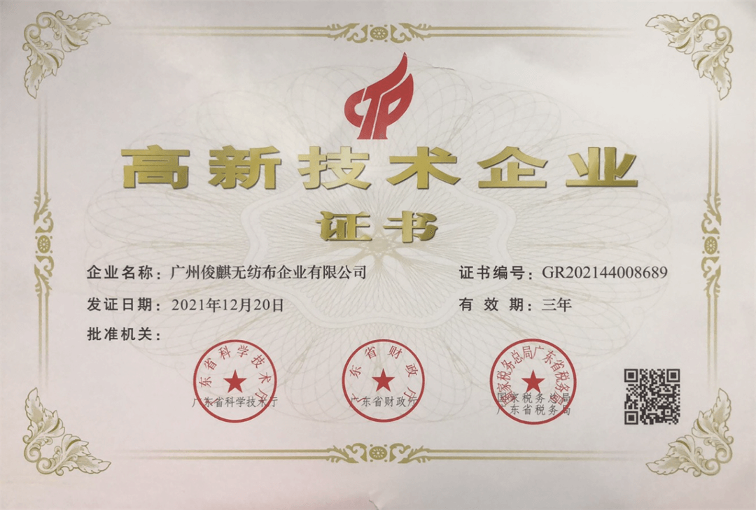 On December 20, 2021, our company obtained the Certificate of High tech Enterprise jointly issued by Guangdong Provincial Department of Technology, Guangdong Provincial Department of Finance, Guangdong Provincial Taxation Bureau and State Taxation Administration. The company has always focused on the field of non-woven fabrics, adhering to market demand orientation and technological innovation as the driving force for enterprise development. It has cultivated a professional research and development team with rich experience and strong independent innovation ability. It has successively obtained 7 utility model non-woven fabric patents in 2019, 1 invention in 2020, and 5 utility model non-woven fabric patents and 2 inventions in 2021, making it one of the few in the industry to master trial models One of the enterprises that invented technology.